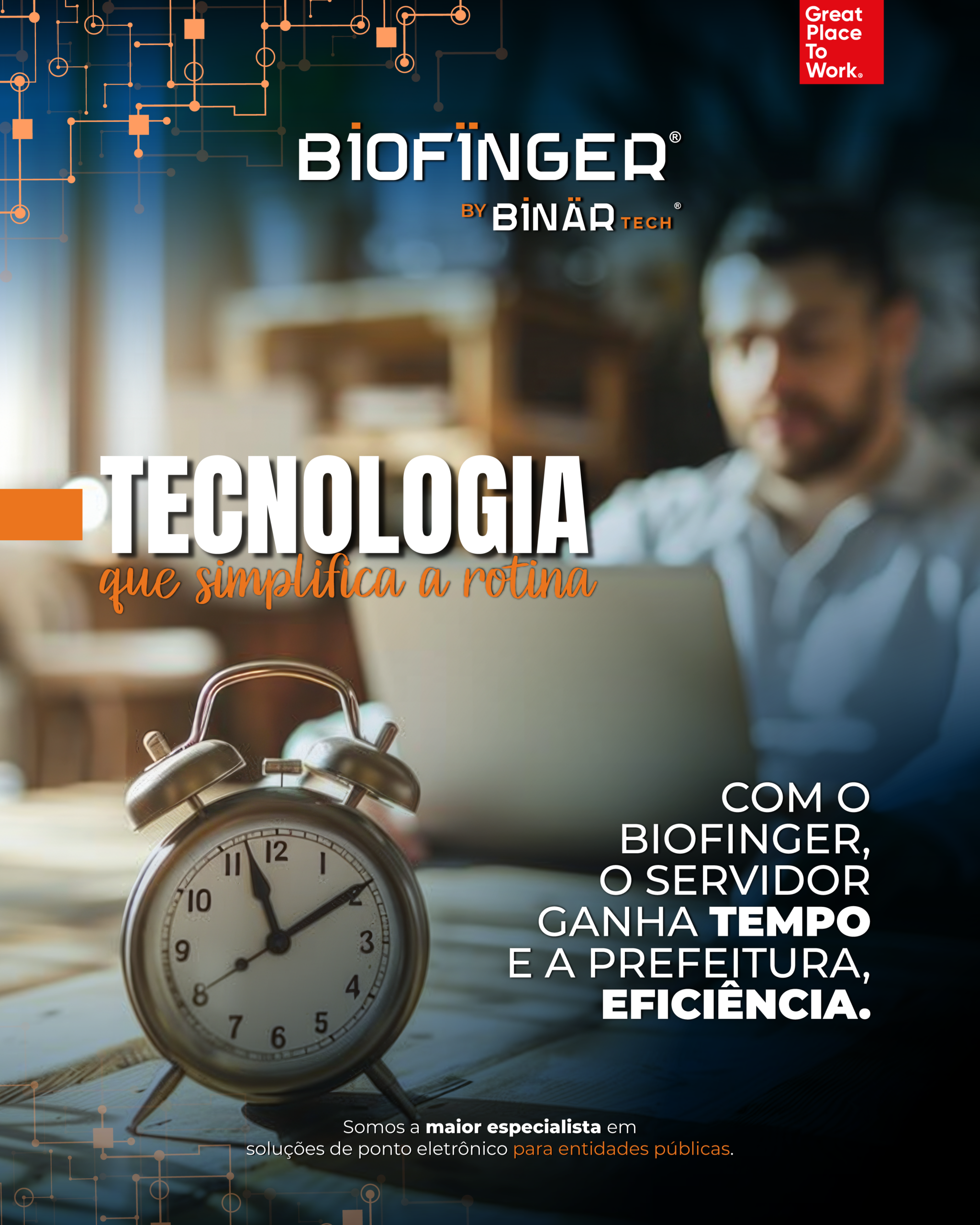 O BioFinger é a solução completa de controle de ponto eletrônico, desenvolvida especialmente para atender às necessidades do setor público. Combina tecnologia de ponta com simplicidade operacional.