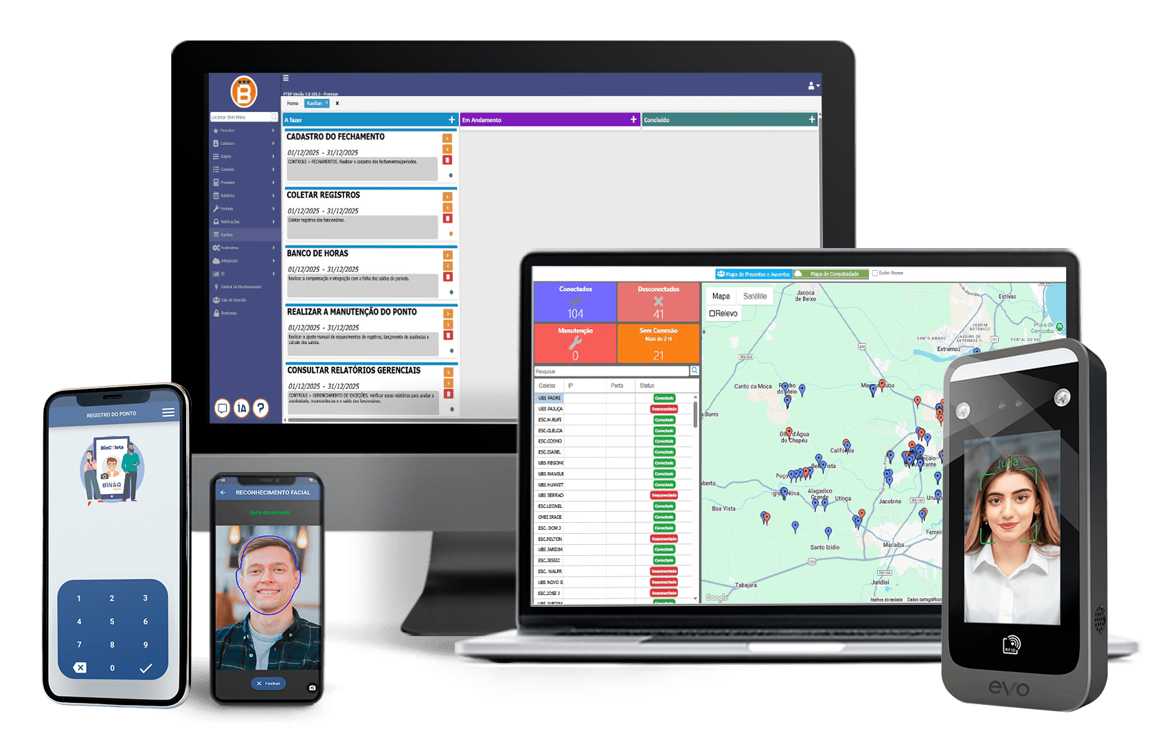 Com opções de registro por biometria, reconhecimento facial e cartão de proximidade, o BioFinger simplifica a gestão da jornada de trabalho, garantindo conformidade com a legislação vigente, como a Portaria 671.